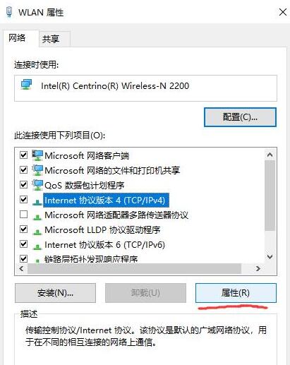 4.选址“Internet协议版本4(TCP/IPv4)”,点击属性