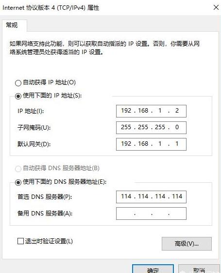 6.选择“使用下面瞪鯬地址(S)”、“使用下面的DNS服务器地址(E)”后,手动输入IP地址和DNS服务器地址,点击确定,则完成静态IP地址设置