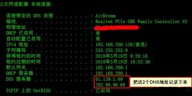 ③ 把电脑的有线网卡禁用再启用后重新输入ipconfig/all看看获取到的DNS地址是不是输入的那2个地址,如果正确的话再观察打开网页是否正常;