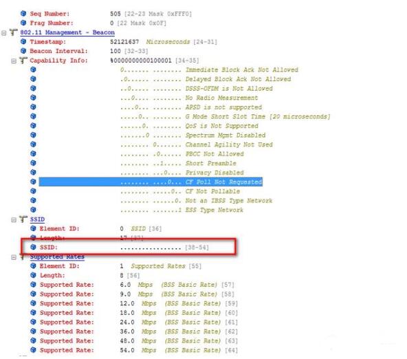 从上图中可以看到,SSID一栏中内容为空,正常如果没有隐藏ssid的话,这里是可以看到ssid名字的,所以并不是隐藏了ssid就不会被抓包破解。隐藏ssid只是让发出的beacon信息中的ssid信息为空,但还有其他很多信息比如信道,频宽,支持的速率集,其他一些wifi特性等等。另外正常的控制帧和数据帧都会被探测到,所以隐藏ssid并不是比较保险的方法。