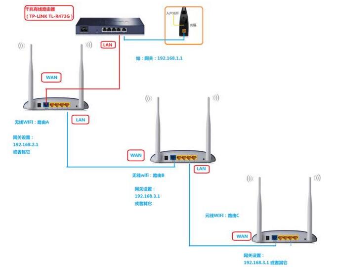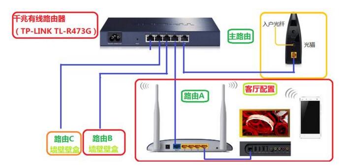 本方案的优点是:路由A,B,C互不干涉,缺点就是比较浪费网线,家里的工槽要考虑到。