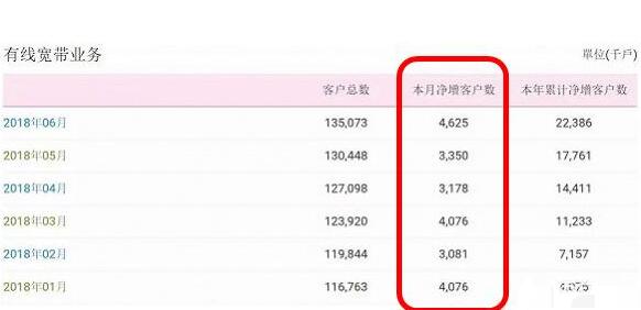 2018年6月三大运营商的用户对比如上,可见,中国移动的宽带用户数,6月新增462.5万,远远超过中国电信的宽带用户新增数量134万,但是三大运营商里就连宽带增幅垫底的中国联通也增加了29.7万。所以,说中国电信的宽带用户数变少了是个伪命题。