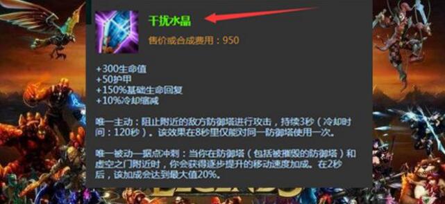 笔者说的这件装备就是干扰水晶,这件装备在英雄联盟中应该是很冷门的装备了,很多萌新似乎听都没有听到过这件装备;这件装备有个神奇的主动效果,可以阻值敌方的防御塔攻击,持续效果是3秒。但是这个效果看似强势,但是却因为性价比较差而很少有人出它,从来没有进入过主流出装和玩法里面。