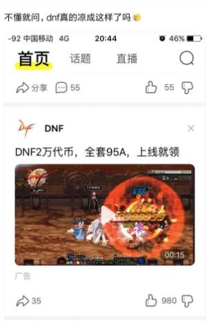 DNF目前负面新闻太多了,玩家脱坑发帖吧、录视频,装备或职业改版,发贴吧讨论,总之。现在消息流传的太快了。针对贴吧投放广告这一事情,有人猜测DNF已经靠广告来吸引玩家了。dnf最近流失的玩家比较多,策划也已经意识到了这些,疯狂推出各种真香活动来挽留玩家。有玩家发现,dnf不仅明面上出各种活动吸引玩家,在各方面渠道的宣传也很到位。