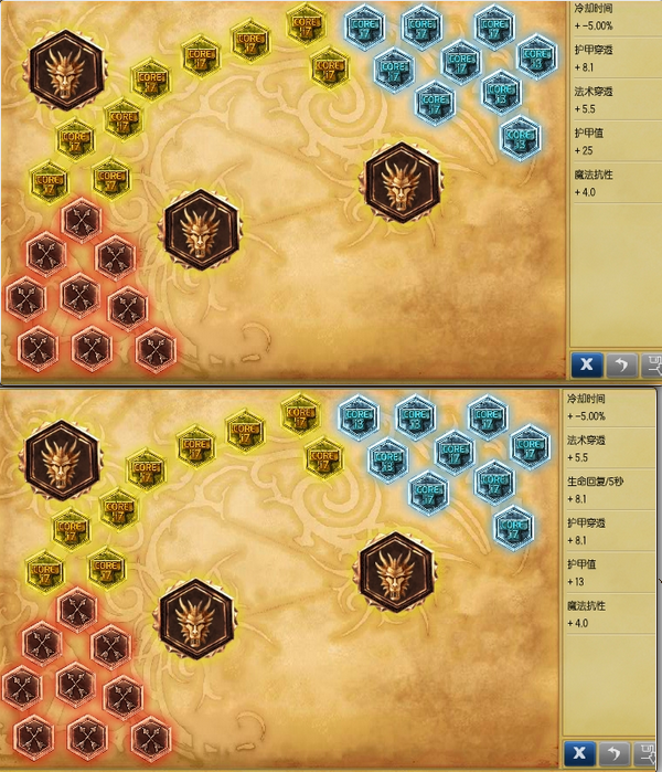 红色双穿,黄色护甲,蓝色3个魔抗6个固定减CD,紫色是3个护甲或者3个5回 。